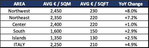 In October 2024, the average Italian asking price stood at €2,250/sqm (€210/sqft). Property prices are highest in the Northwest, at €2,450/sqm (€230/sqft) on average, and lowest in the Italian Islands, with €1,350/sqm (€130/sqft).