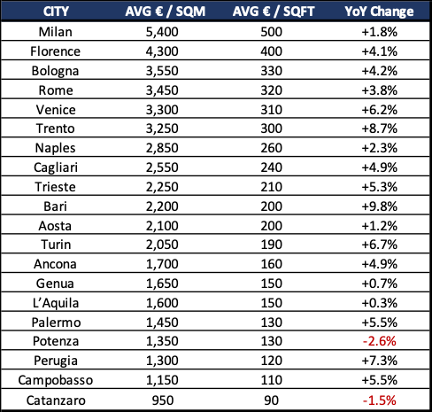 You won’t be surprised to find that Milan is yet again the city with the highest property prices, with an average of €5,400/sqm (€500/sqft). But the rush to price increases in the business capital of Italy seems to finally be slowing down: in October 2024 month there was a minimal decline of -0.2%, while during the past 12 months, the growth was relatively mild at +1.8%. The second and third most expensive Italian cities are Florence (€4,300/sqm and +4.1% YoY) and Bologna (€3,550/sqm and +4.2% YoY).